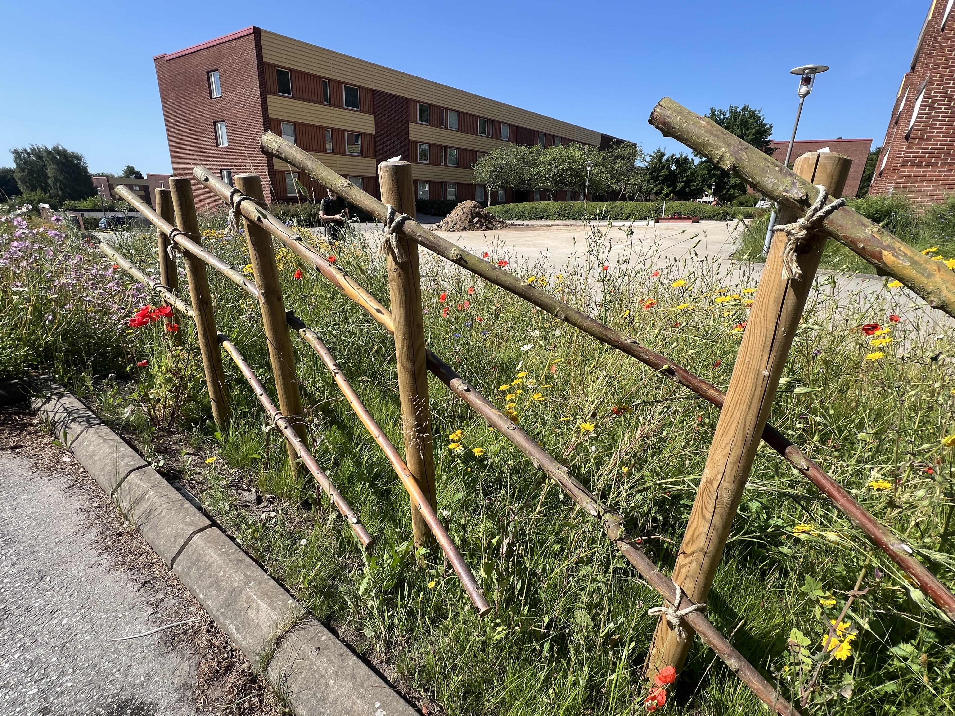 Runt parkeringarna var det tidigare täta buskage av vresrosor, men Anticimex konstaterade att råttorna i området hade sina bon i buskagen. Nu har buskarna grävts upp och bytts ut mot blomsterängar, samt hemgjorda staket. På så sätt försvåras för råttorna samtidigt som den biologiska mångfalden gynnas. Möjligen är de röda gladorna som svävar över oss denna soliga dag lite besvikna över att råttorna inte längre gynnas i området, men de flesta andra är positiva till insatserna.