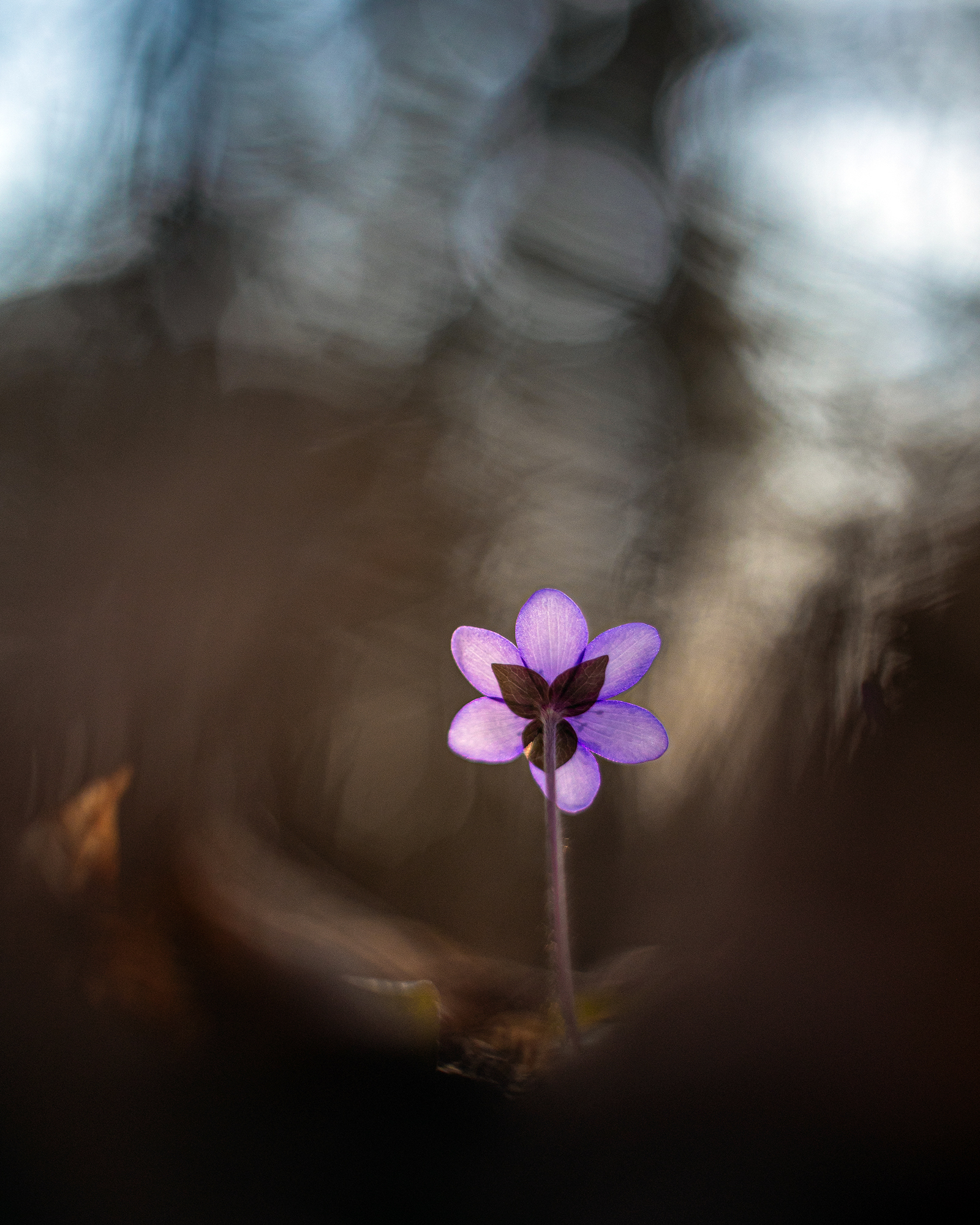 Blåsippa i kvällsljus i ek- och hasselskog.
