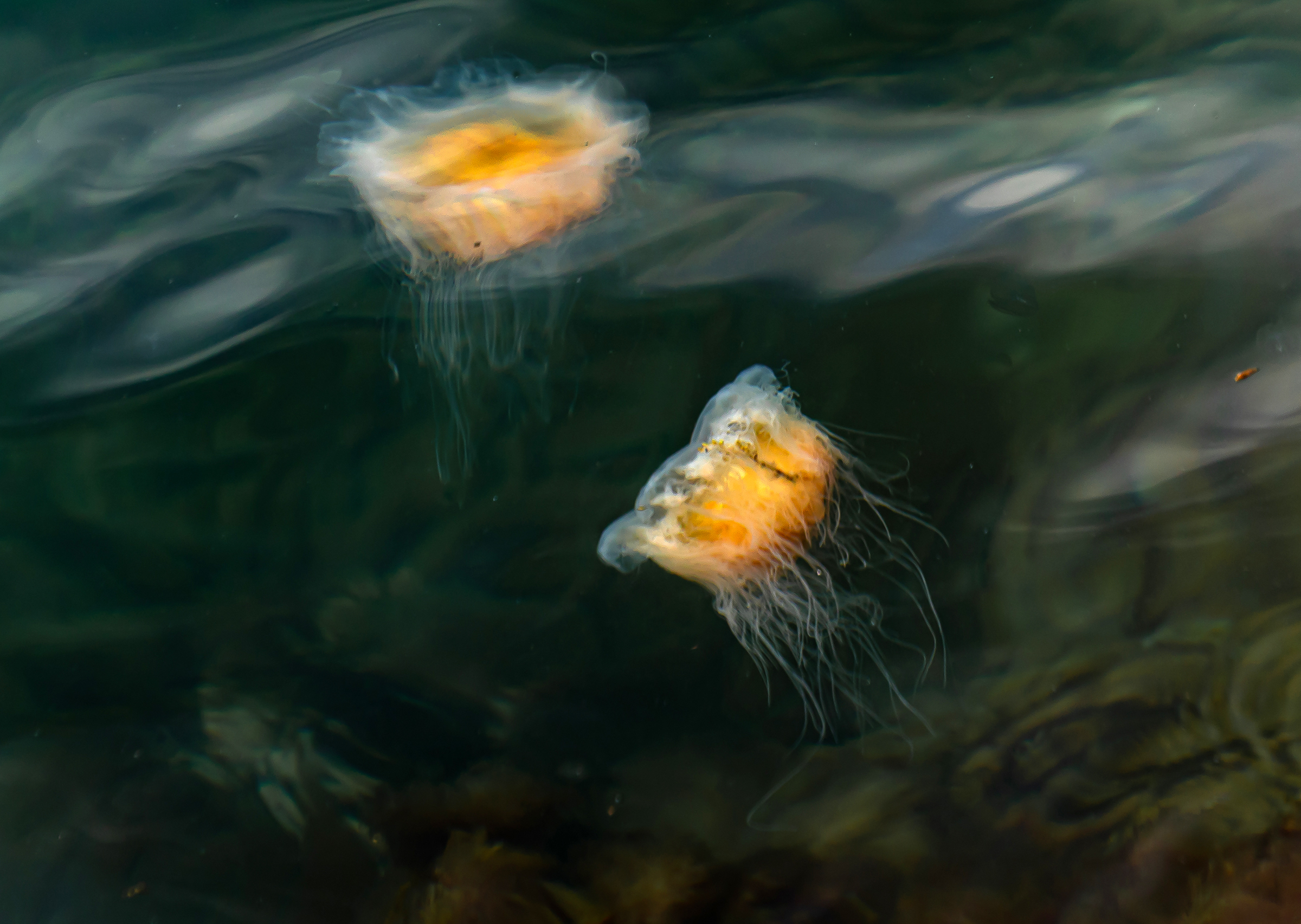 Framåt sensommaren gick PhotoNaturas höstweekendtur till Gullholmen på västkusten. Här finns en uppsjö av motiv för alla smaker, den mysiga fiskebyn, klippor, ljunghedar och mycket mer. Ett av motiven som jag fastnade för blev brännmaneterna, vackra och fascinerande. För att fotografera dem utan att jobba med undervattensfoto krävs för det första att det är helt vindstilla, för det andra att vattnet är kristallklart och slutligen att man använder ett polarisationsfilter för att reducera reflexerna på vattenytan. Här har jag försökt att visa maneternas långsamma dans över den gröna havsbottnen. Detta är också den enda av mina fem bilder som inte är tagen i Vattenriket.
