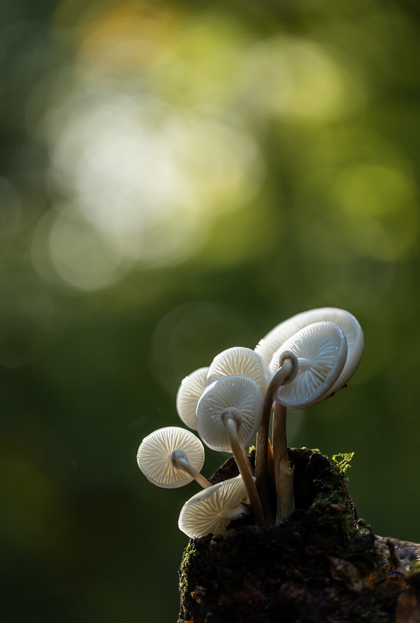 Porslinsskivlingar i motljus på bokstubbe.