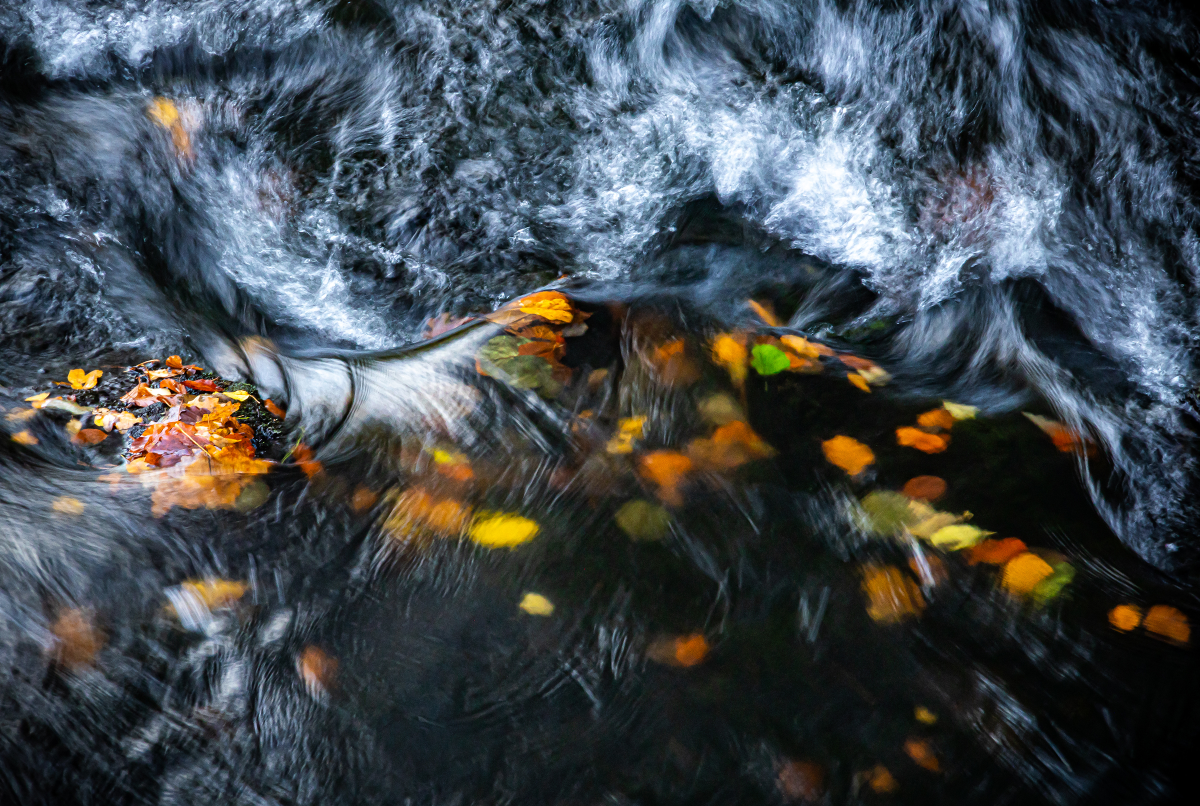 Sista bilden från vårt fina biosfärsområde är fångad vid Mjöån på norra sidan av Linderödsåsen. Här finns en riktig liten pärla, ett naturreservat; Åbjer, i form av en djup ravin genom bokskogen med ån som porlar fram bland mossiga stenar och stockar. Ett ganska okänt naturreservat som även ingår i ett skånskt projekt för att visa på ”tysta platser” för rekreation och återhämtning här i nordöstra Skåne. På bilden ett miniatyrlandskap i ån, taget i månadsskiftet oktober-november när höstfärgerna är som finast. Lång slutartid och polfilter för att fånga mjukheten i vattnet.