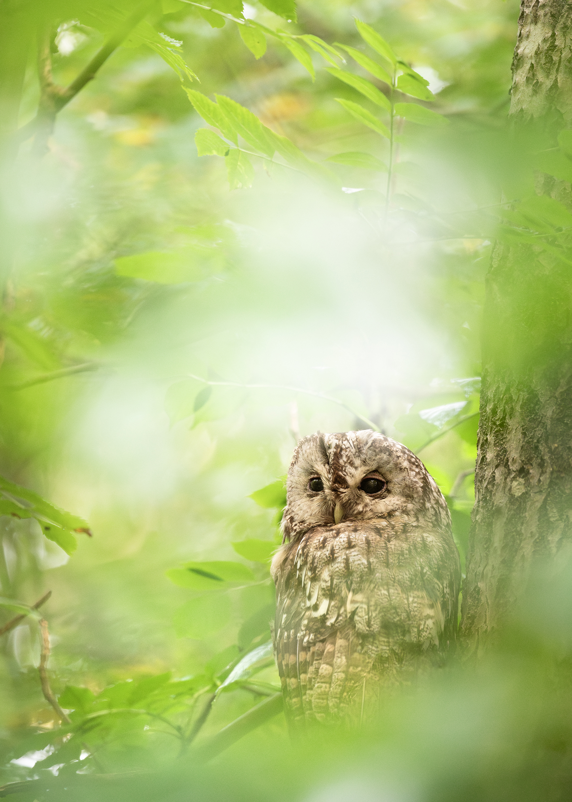 Kattugglor finns det gott om i området där jag bor, men det är sällan jag får se dem så här. Den satt helt öppet på en gren nästan i ögonhöjd, precis intill en större gångstig. En så oväntad placering att inte ens småfåglarna lagt märke till den! Jag backade långsamt, tog några bilder genom ett lövverk och vände för att hitta en annan stig och inte störa.