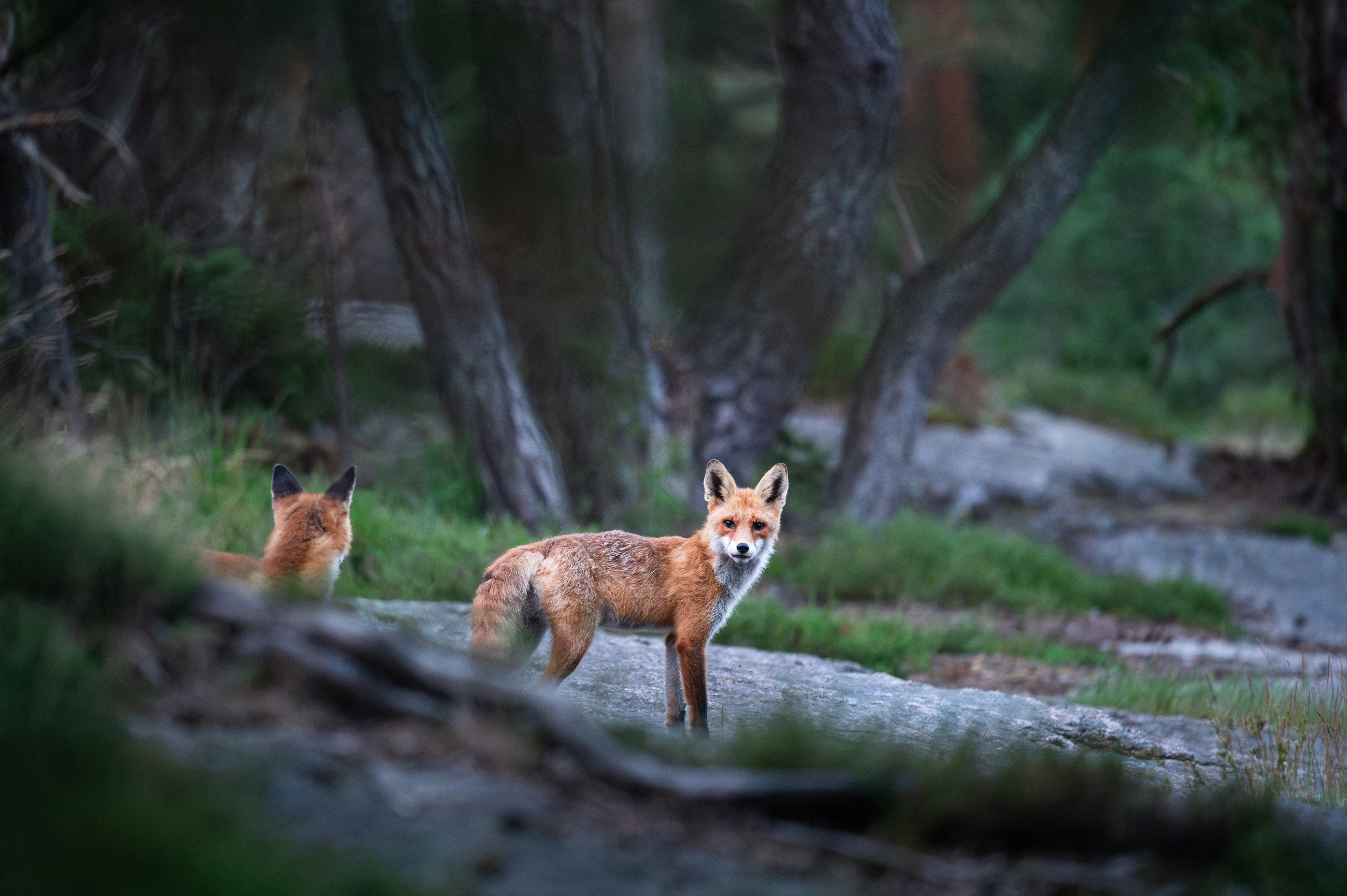 Ett oväntat rävmöte är alltid en fantastisk upplevelse. Jag går alltid väldigt tyst när jag går på mindre stigar, för man vet aldrig vad som kan dyka upp. Jag hann iaktta de två rävarna en liten stund, tills den ena skuttade ut där sikten mellan oss var fri och jag blev upptäckt där jag satt på huk med kameran.
