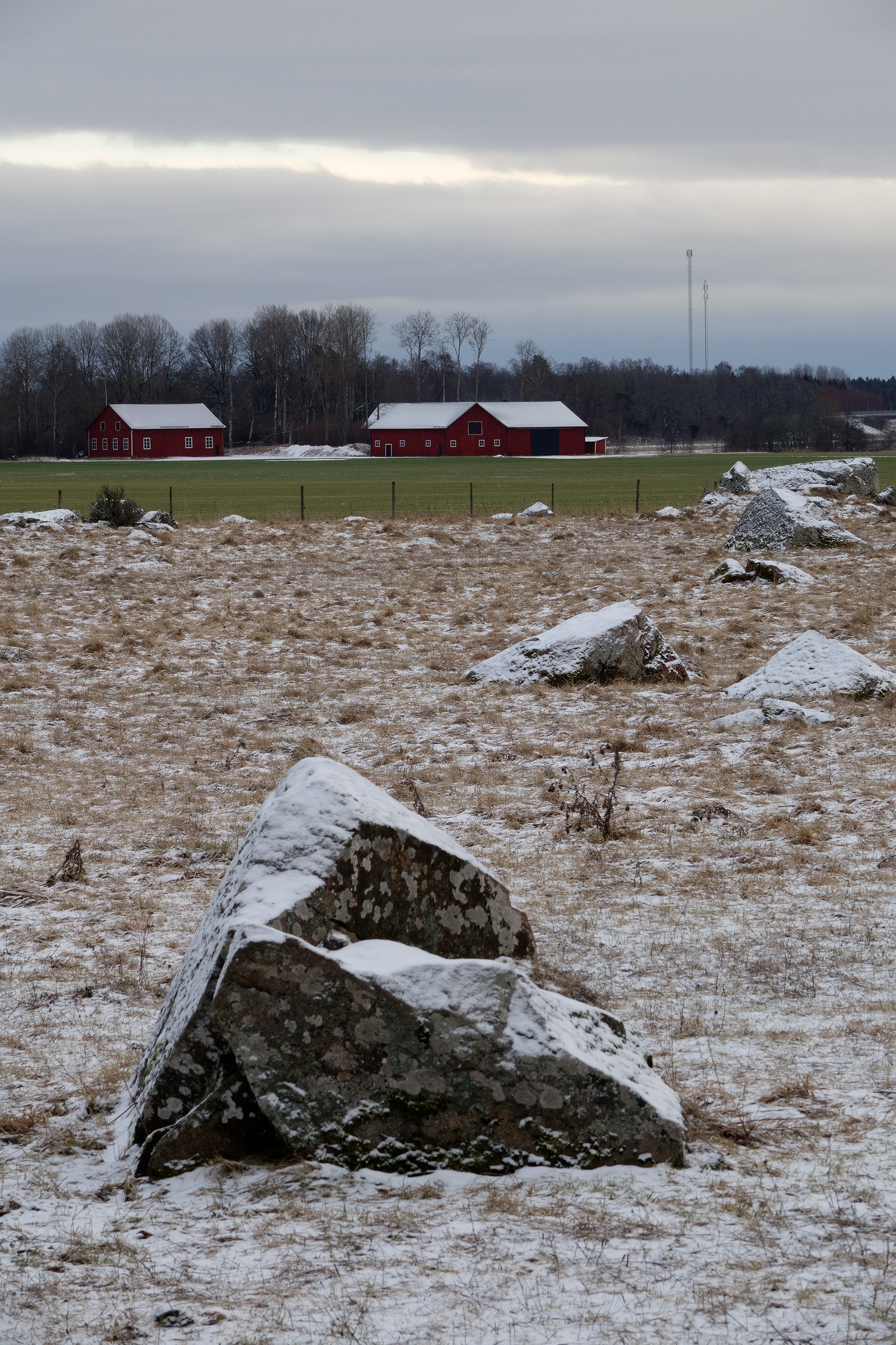 Det är inte ofta som det är mycket snö under vintern i Uppland. Den här platsen åker jag ofta förbi och jag har sett potentialen för en bild i min stil härifrån. Stenarnas form som möter formerna på taken på ladorna. Men först när lite pudersnö lagt sig över landskapet blev det en bild som jag stannade till för att föreviga. Landskapet innehåller ofta kraftledningar och telemaster som jag kanske inte älskar att få med på bild, men de finns ju där och det då gäller att då att få in dem i kompositionen också.