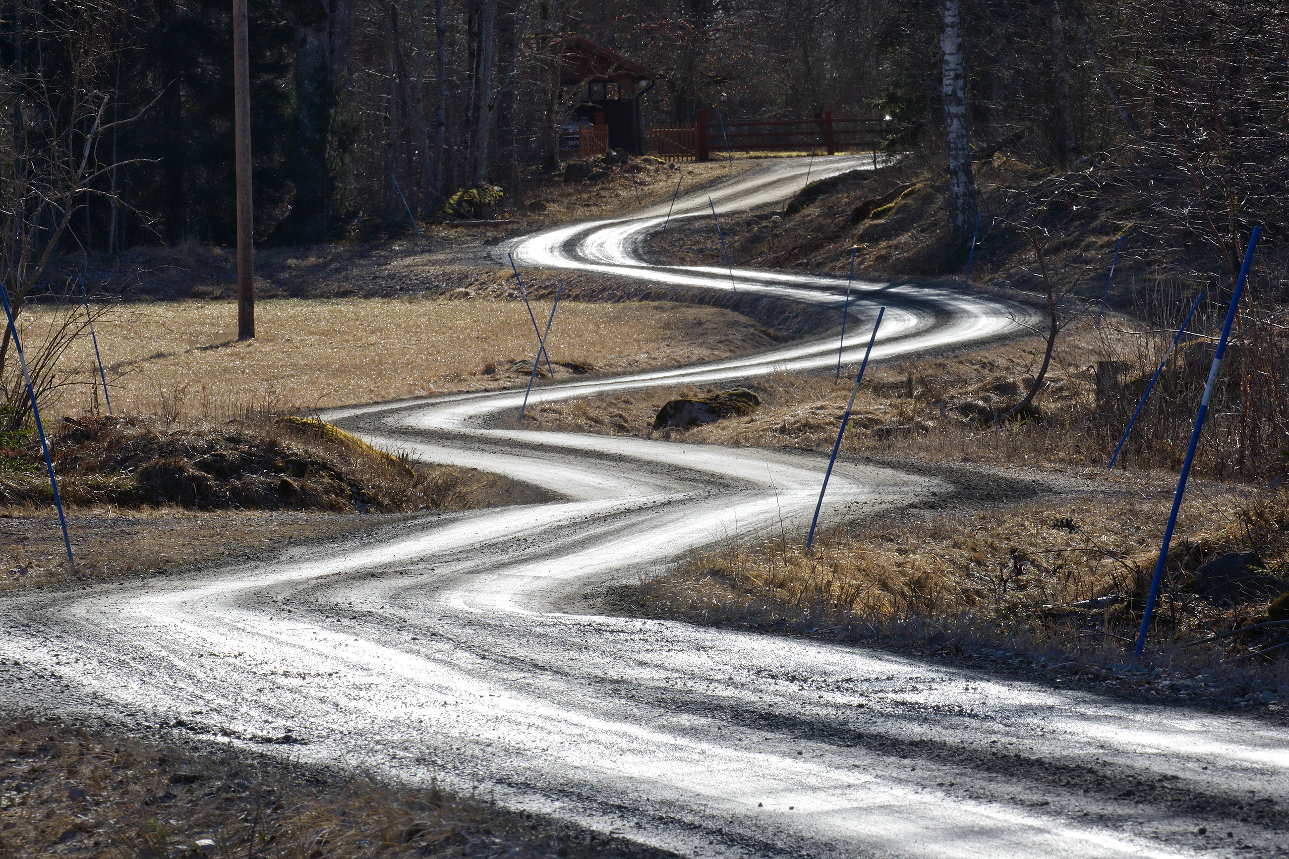 Här valde jag ett lite längre objektiv för att förstärka känslan av den slingriga våta grusvägen i slutet av mars när snön smält bort i norra Uppland. Telefonstolpen fick hitta sin plats i kompositionen och jag är glad att snöpinnarna inte var orange just här.
