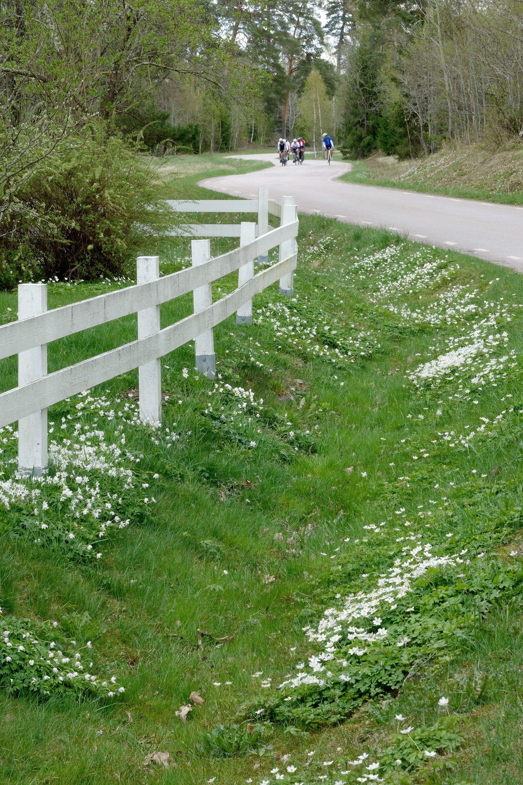 En vårbild där naturen invaderar dikeskanten och harmoniserar med det vita villastaketet. Jag vill arbeta igenom mina motiv länge när jag fotograferar och jag använder ofta stativ. Då kan jag låta kameran hålla det funna utsnittet ett tag och jag kan vänta på att något spännande kommer in i bilden medan jag jobbar med något annat med den andra kameran. Just som det skedde denna vårdag öster om Uppsala.