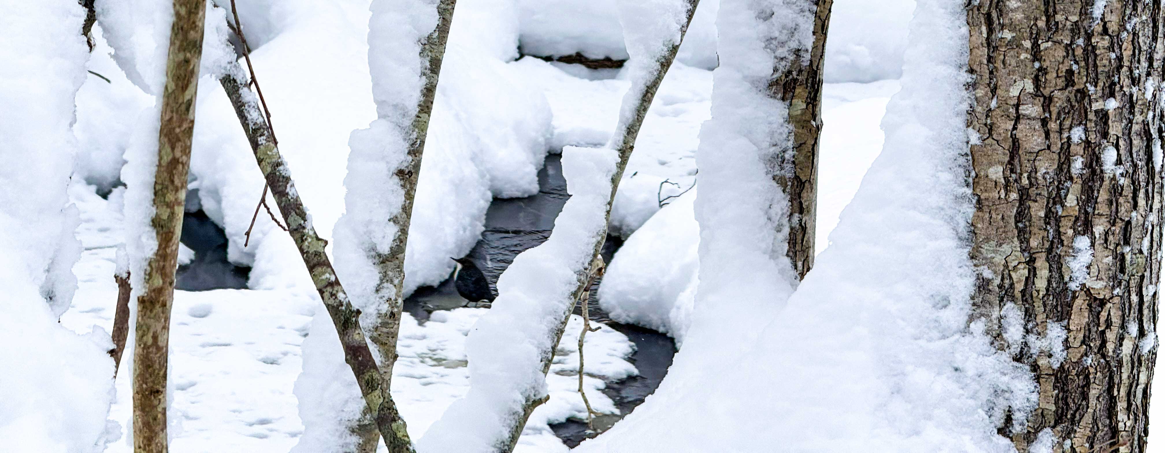 En strömstare gömmer sig bland trädstammarna i Truskbäcken. Foto: Emil V. Nilsson.