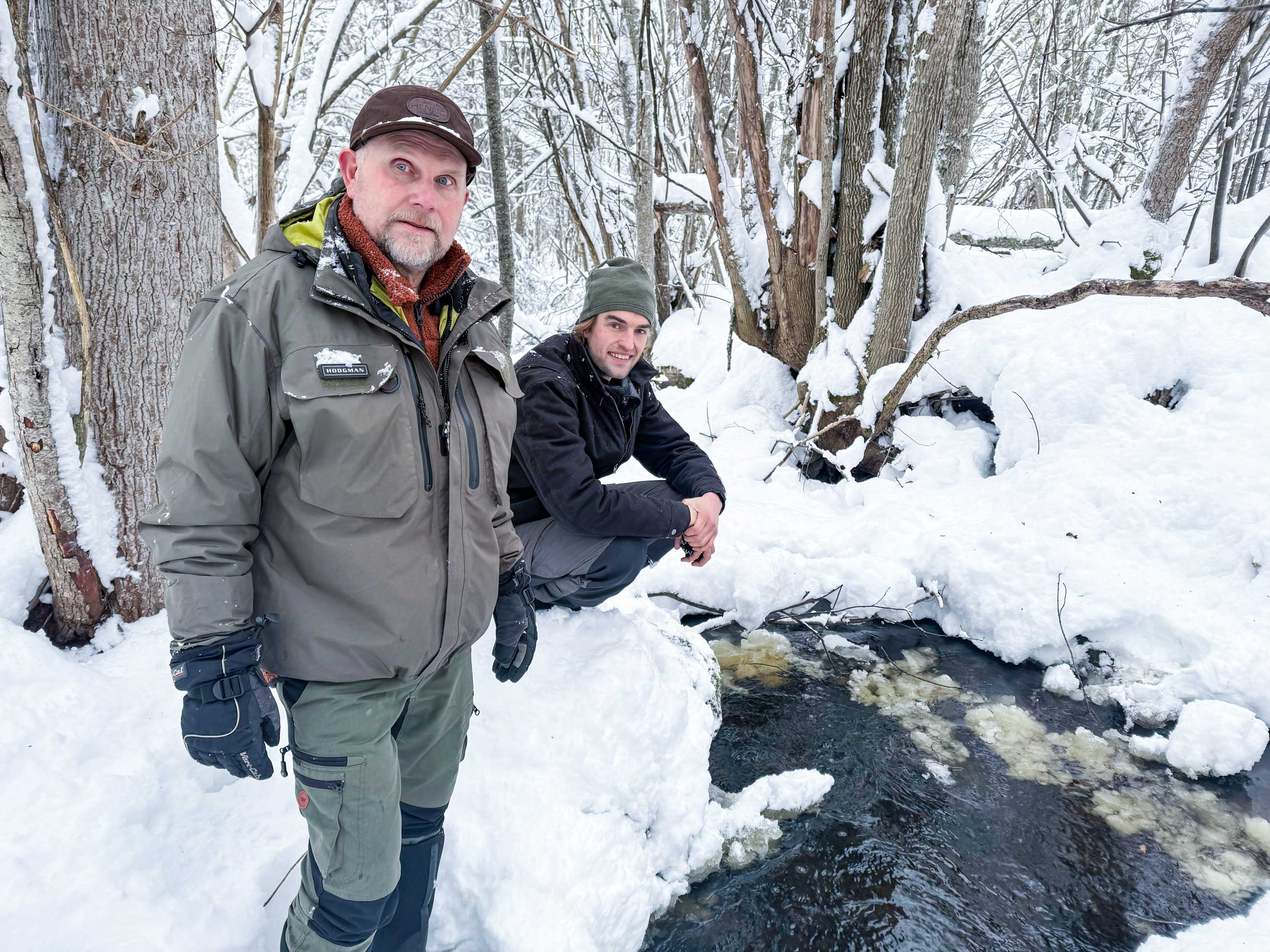 Roger Timbré (till vänster) och Ian Zakrisson vid Truskbäcken i Norduppland. Foto: Emil V. Nilsson.