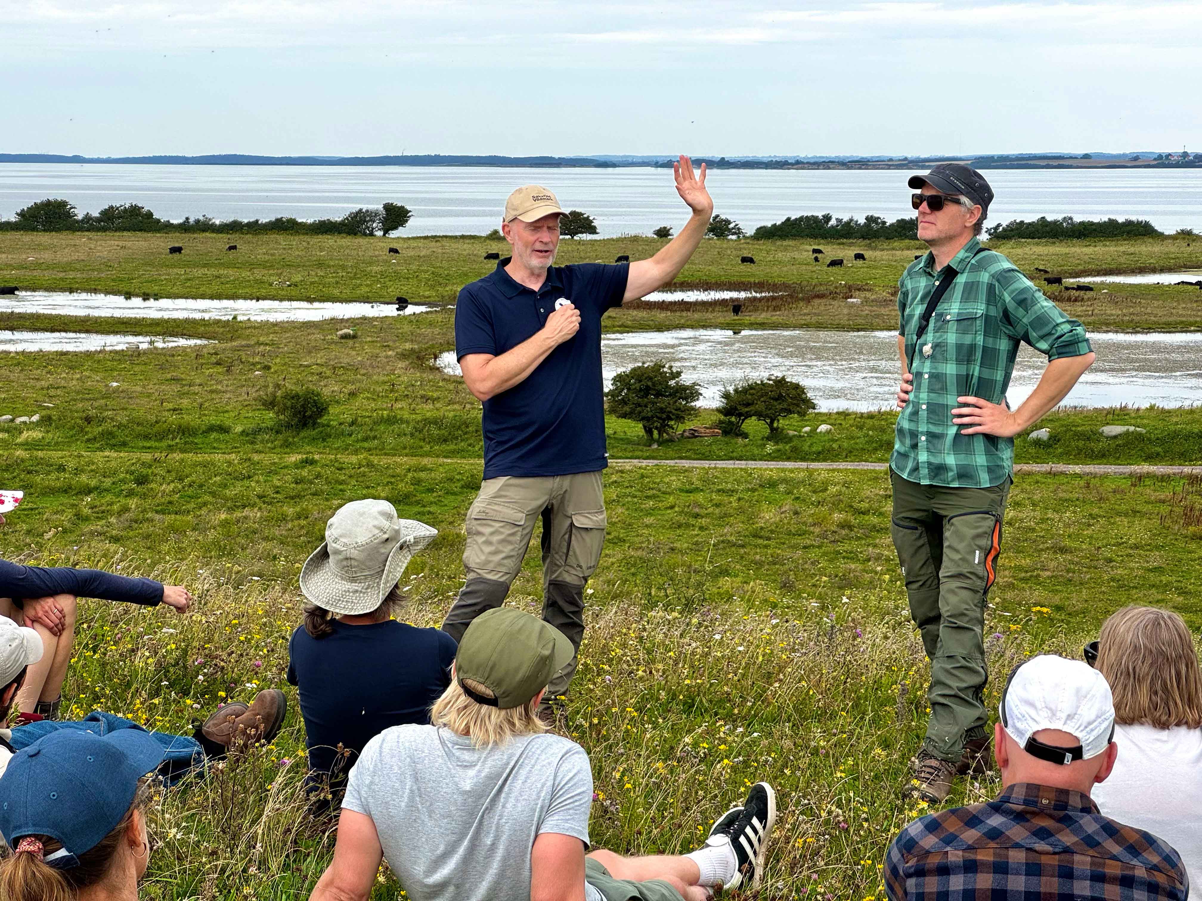 Peer Ravn från företaget Ravns nature (t.v.) och Carsten Horup Bille på Voldingborg kommune berättar om hur åretruntbete med nötboskap av rasen Galloway samt Exmoore hästar fungerar på över hundra hektar av återskapad gräsmark. All mark som syns på bilden var tidigare åkermark med vallodling av gräs som sedan år 2020 såtts in med frön från vilda växter. Foto: Emil V. Nilsson.
